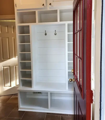 - Storage solutions such as built-in benches, cubbies, cabinets, and hooks.